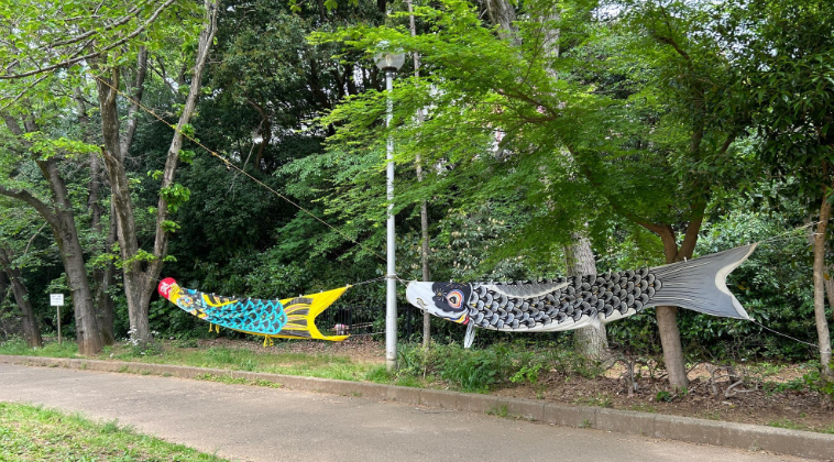 5月になると広場に鯉のぼりが設置されます。その数、50匹!