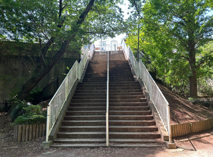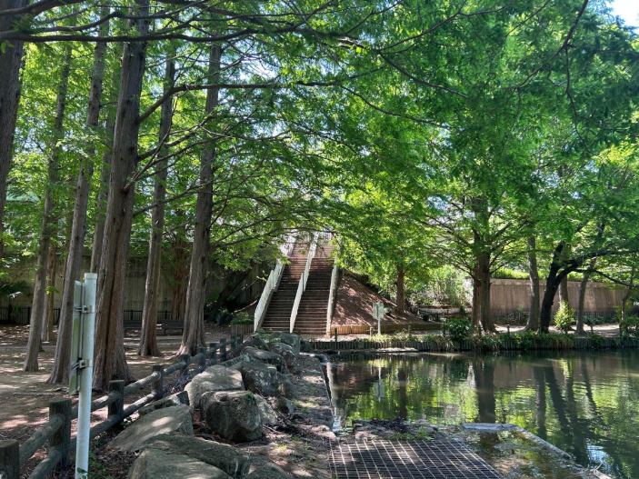 広場に行くには、貝柄山公園の池の横にある階段を上ります。