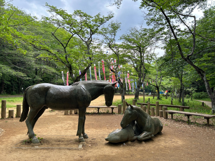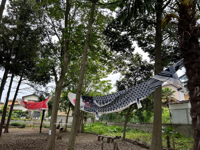 広場の奥には、ジャンボサイズの夫婦鯉のぼりも!こじんまりとしていて、緑が多く、のんびりリフレッシュできる広場でした。