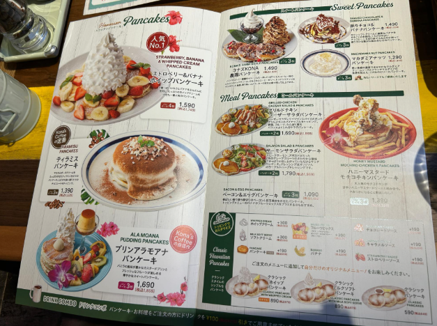 人気メニューのパンケーキは、フルーツ系やお食事系なども楽しめます。