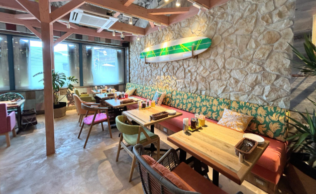 サーフボードやハワイアン雑貨に囲まれた空間。