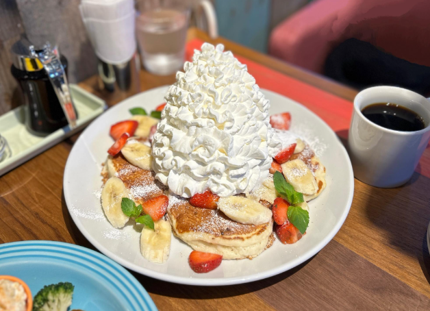 パンケーキの上に乗った積み上がった生クリームの高さは10センチ以上!
