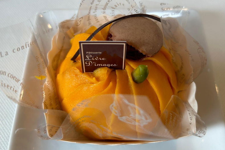茶巾絞りのような見た目の「カボ」。ちょこんと上にのっているマカロンがかわいい!カボチャペーストで、ショコラクレームとかぼちゃクリームをくるんでいました。外側は濃厚、中は優しい甘さで、かぼちゃ好きさんは大満足すること間違いなし!