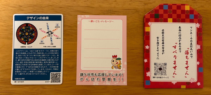 マンホールカードといっしょにメッセージカードも一緒にお守り袋にいれて、受験生を応援しようと「合格祈願マンホールカード」として配布をはじめました。