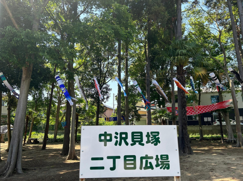 「中沢貝塚二丁目広場」にも鯉のぼりがたくさん泳いでいたので、紹介します。