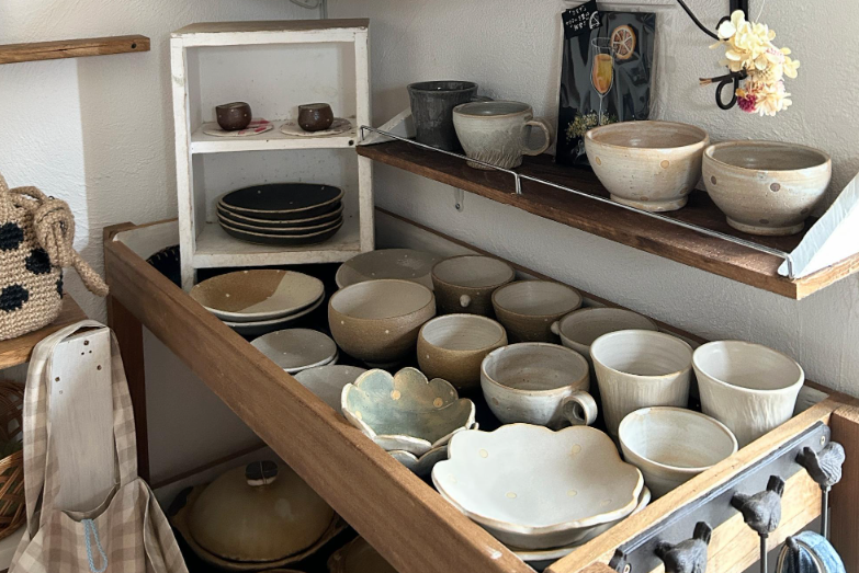 入口の一角には、陶芸作品も。暖かみのあるハンドメイドの作品は、見ているだけでほっとする空間でした。