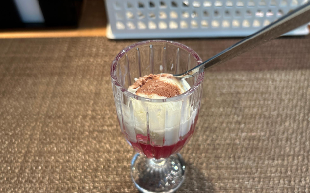 ランチAのデザート。この日はストロベリーゼリーの上にバニラアイスがのっていました。