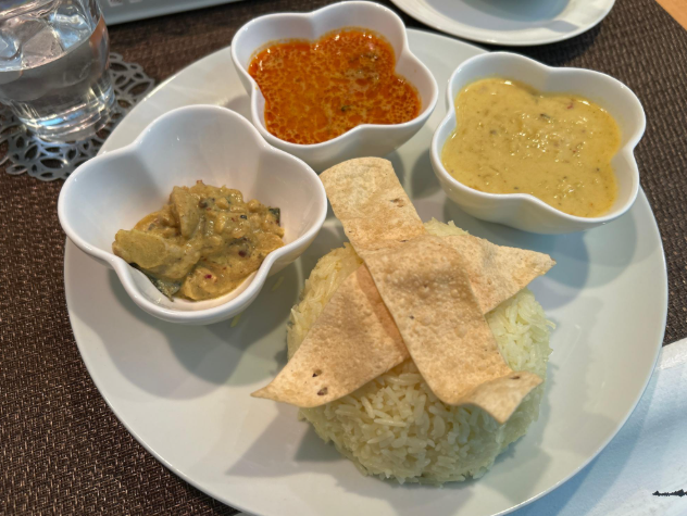 カレーは、スパイスが効いていますが、ココナッツの風味が口に広がり、後味はまろやか。
